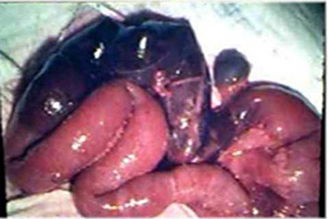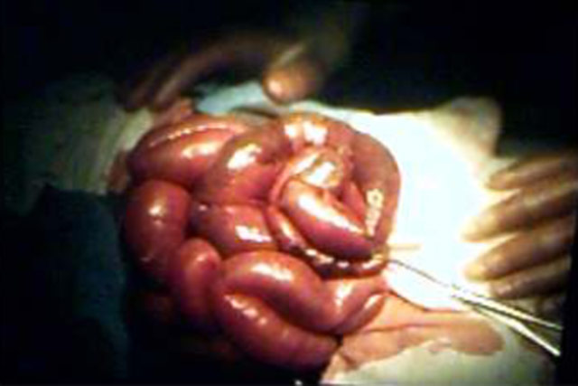 Á laparotomia vemos alças de íleo terminal com sinais de sofrimento, áreas de necrose.