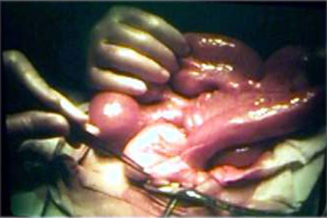 Vemos no meio do campo operatório uma imagem que corresponde a uma compressa sendo fagocitada pelo duodeno.