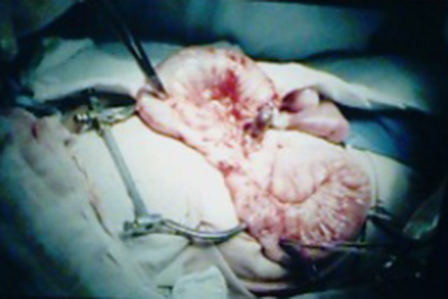 A laparotomia evidenciamos obstrução intestinal por diverticulite de Mekel com formação de brida e necrose de alça intestinal.