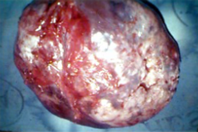 A laparotomia vemos imagem de fecalitono 1/3 distal do apêndice com presença de necrose.