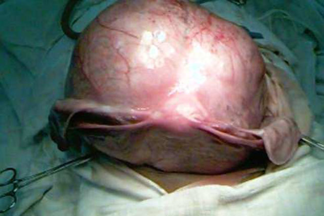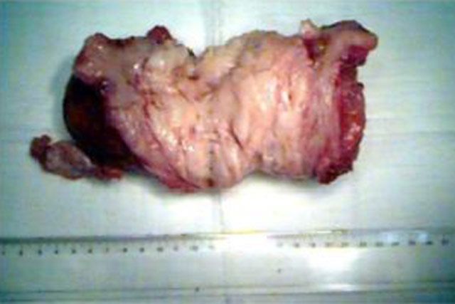 Veja na foto uma peça cirúrgica aberta a partir de cirurgia de leiomioma uterino.