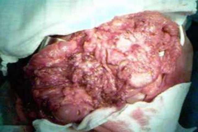 Veja na foto a tumoração de colon com implantação em grande epiplon.