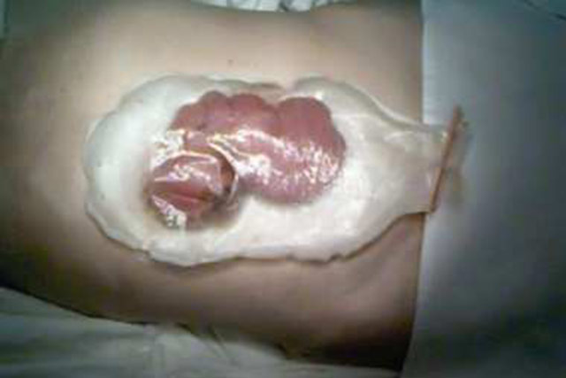 Na foto podemos ver uma bolsa de colostomia segurando prolapso de colostomia.