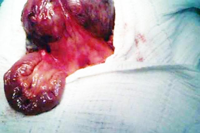 Foto mostrando a relação do tumor retro sacro exteriorizado.