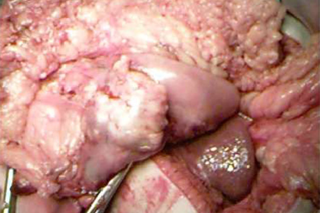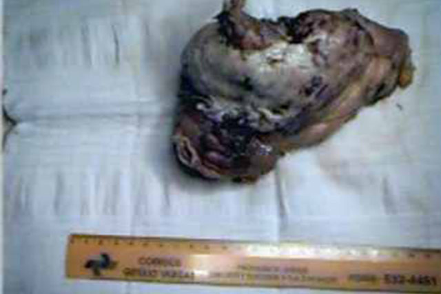 Foto com visão do tumor de leiomiossarcoma gástrico.