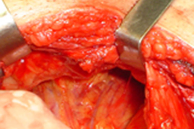 Fechamento do peritôneo em jaquetão. Os bordos da aponeurose não se encontravam, havia muita tensão.